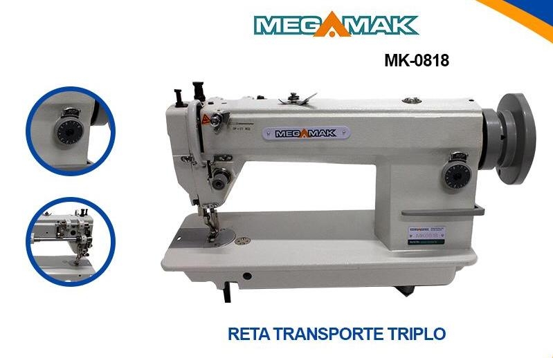 Máquina reta industrial transporte triplo com 1 agulha e ponto fixo. Possui ajuste de sincronismo de altura dos calcadores e triplo transporte, por dente, agulha e calcador, que auxiliam no transporte dos tecidos.